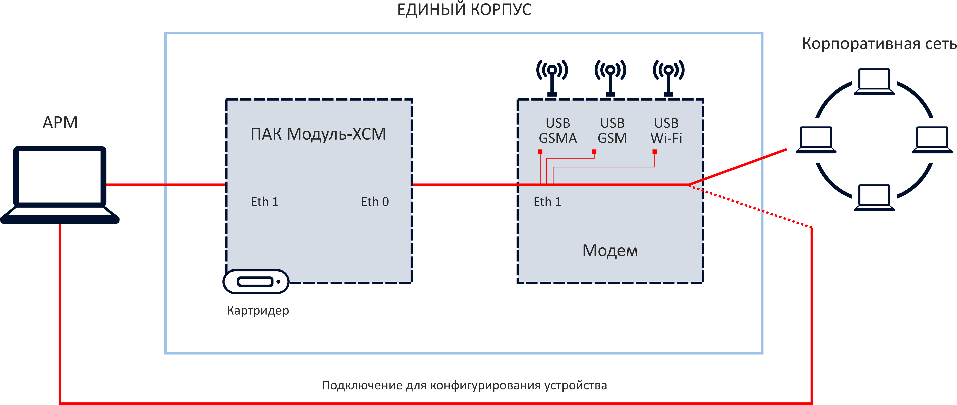 Мобильное защищенное удаленное рабочее место представляет собой коммуникационную подсистему, состоящую из программно-аппаратного комплекса «Модуль-ХСМ» и устройства доступа в сети Wi-Fi, GSM/UMTS и CDMA.